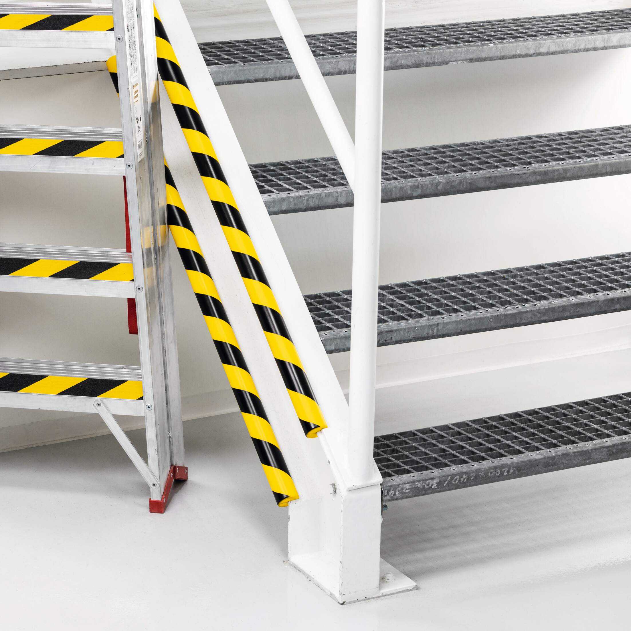Varnings- och skyddsprofiler som detta runda kantskydd används inom industrier och andra inomhusmiljöer för att skydda personer, fordon och inredning vid lättare sammanstötningar. De svart/gula ränderna varnar utstickande balkar och kanter och polyuretan skummet, som skyddsprofilen är tillverkad av, är stötdämpande. Det självhäftande kantskyddet skärs till önskad längd med en vass kniv. Stark, självhäftande klisteryta av god kvalitet som bl a fäster på metall, trä, kartong och kakel med bäst resultat om temperaturen är 10-30°C. Färgnyanser enligt ASR A1.3 liknande RAL 1004/9003 (signal gul/signalsvart).